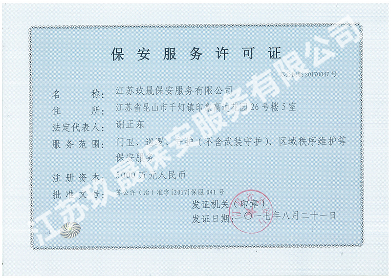 江蘇玖晟保安服務有限公司成立于江蘇省昆山市千燈鎮。注冊資金:2000萬,是擁有省公安廳頒發的保安服務許可證的企業【蘇公保服20170046】,也是昆山市保安協會常務理事單位。